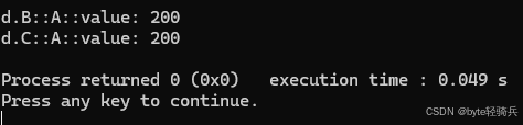 std::cout << "d.C::A::value: " << d.C::value << std::endl; // 输出200(与d.B::value共享同一份数据)