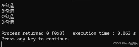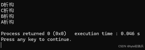 D 自身的析构函数。C → B)。A 的析构函数。代码示例:析构函数调用顺序验证