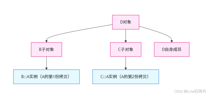 B 子对象(包含 B::A 实例)。C 子对象(包含 C::A 实例)。D 自身的成员。内存布局示意图(普通继承)