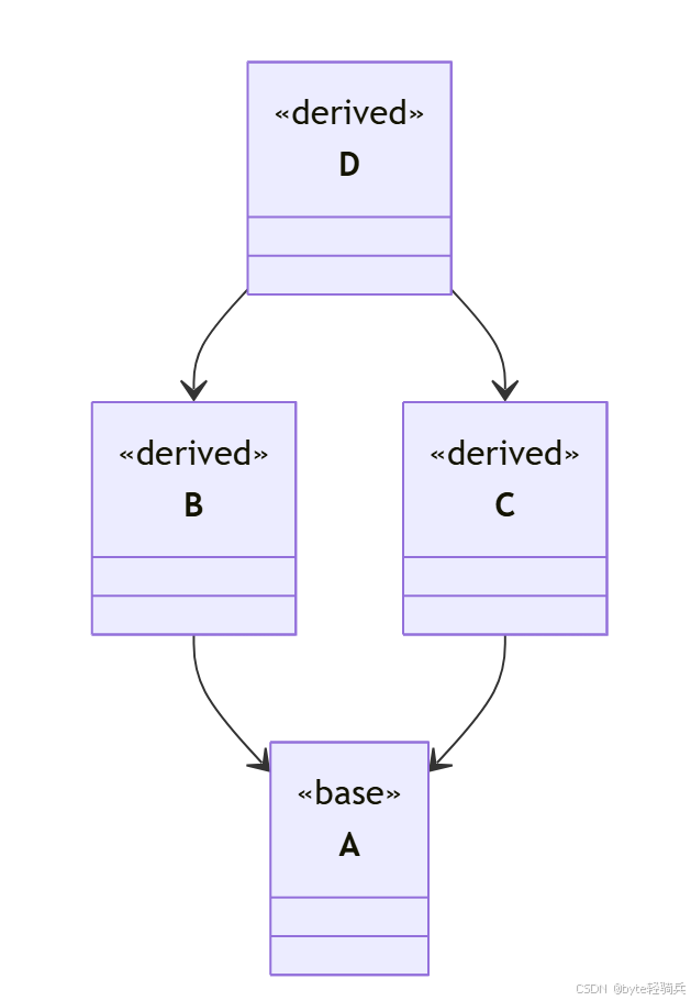 A(公共祖先)。B 和 C 均继承自 A。D 同时继承 B 和 C。类关系图: