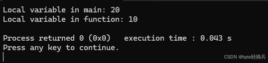 std::cout << "Local variable in function: " << localVar << std::endl;