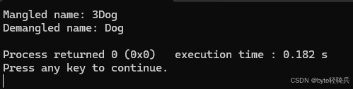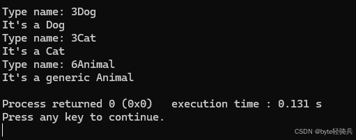 type_info::name()返回的类型名是编译器特定的修饰名(Mangled Name),例如 GCC 中Dog的修饰名是3Dog(3表示类名长度,Dog是类名)。可通过abi::__cxa_demangle函数美化(需链接libstdc++)。