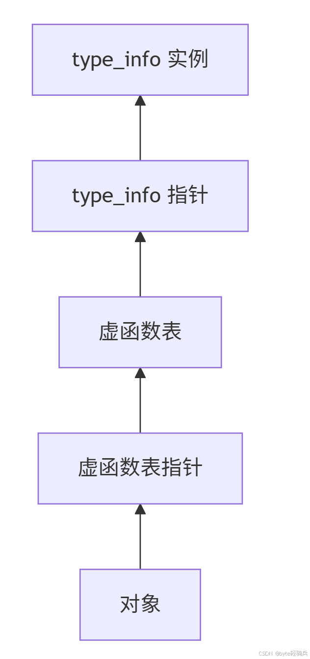 type_info对象只能通过typeid获取,无法直接构造或复制type_info存储:多态类的虚表(vtable)中包含type_info指针,因此dynamic_cast和typeid可通过虚表访问运行时类型信息type_info::operator==比较的是类型的唯一标识符(如 GCC 使用__type_info结构体的地址作为唯一标识)