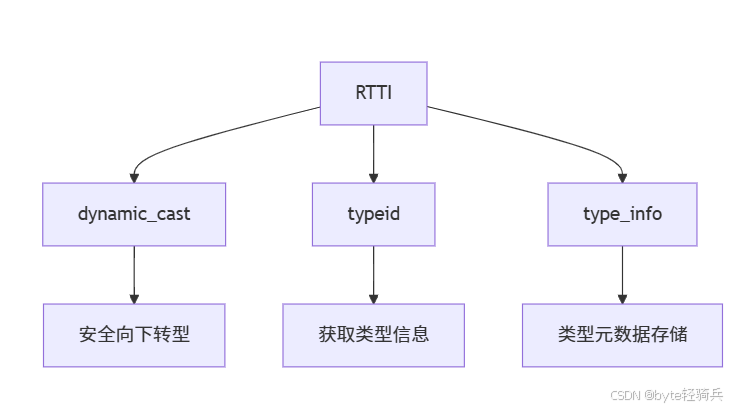 运行时类型识别(Runtime Type Identification, RTTI)是 C++ 标准提供的一组机制,允许程序在运行时获取对象的类型信息。RTTI 主要用于处理多态场景下的类型判断,是面向对象编程中解决类型转换、动态分发等问题的重要工具。