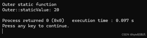 std::cout << "Outer::staticValue: " << Outer::staticValue << "\n"; // 输出:20
