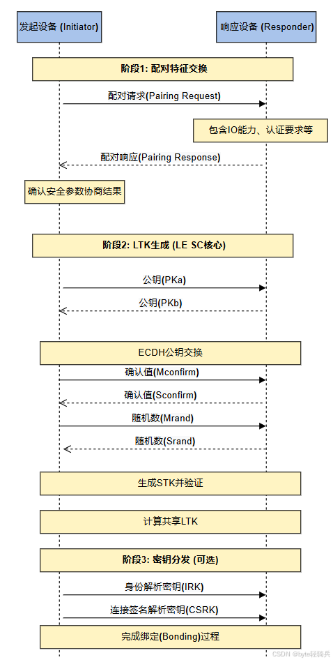 LE SC 的认证过程是设备建立安全连接的关键阶段,分为三个主要阶段:配对特征交换、长期密钥 (LTK) 生成和可选的密钥分发。整个流程通过严格的数学验证和密钥交换,确保通信双方的身份合法性与数据保密性。