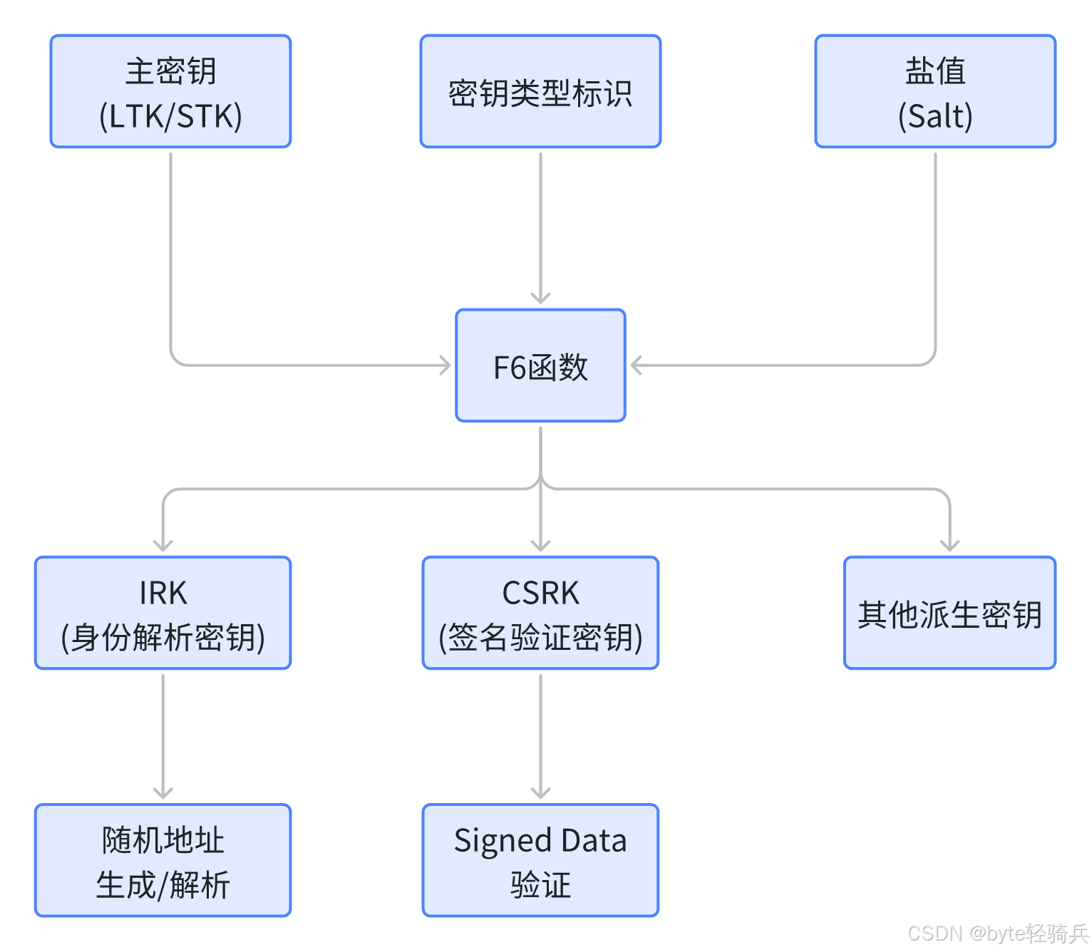 f6 函数用于生成各类派生密钥,包括身份解析密钥 (IRK) 和连接签名解析密钥 (CSRK)。这些密钥在设备绑定后用于地址解析和数据签名验证。