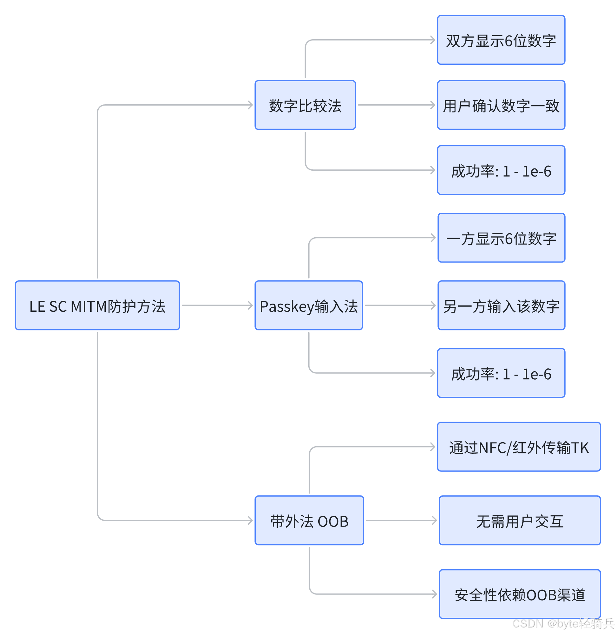 LE SC 的 MITM 防护基于 "双因素认证" 思想:不仅验证密钥计算的正确性,还通过用户交互或带外 (OOB) 渠道确认设备身份。蓝牙核心规范定义了三种主要的 MITM 防护方法:数字比较法、Passkey 输入法和带外 (OOB) 法。