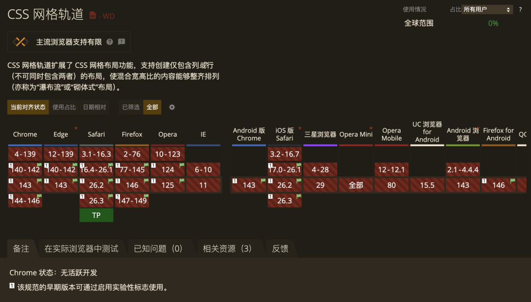 说了这么多激动人心的特性,该泼点冷水了——Grid Lanes 目前的浏览器支持情况,怎么说呢,有点尴尬。