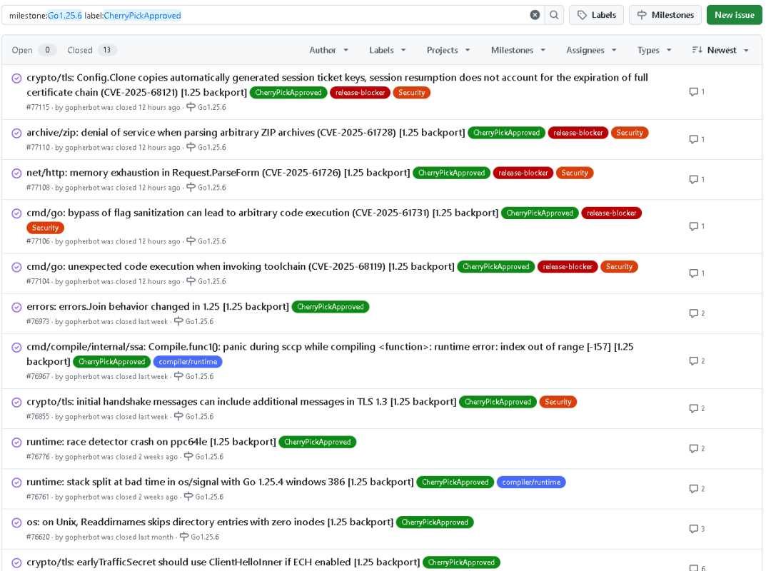 crypto/tlsConfig.Clone 在拷贝时会复制自动生成的会话票据密钥,导致证书链过期后仍可能被错误复用。archive/zipnet/httpRequest.ParseForm 存在内存耗尽风险。cmd/go 工具链相关errors: Join 行为在 1.25 版本中出现差异errors.Join 在多错误组合时的行为不一致问题。cmd/compile/internal/ssasccp 优化时,可能出现 panic 或索引越界的崩溃问题。crypto/tlsruntimeos/signal 堆栈拆分错误的问题。osReaddirnames 可能跳过 inode 为零的条目,本次更新修正此行为。crypto/tls(ECH 功能相关)earlyTrafficSecret 现在将正确使用 ClientHelloInner。以上修复均已通过自动与人工审核,所有 CherryPickApproved 问题均已标记为 Closed(已完成)。