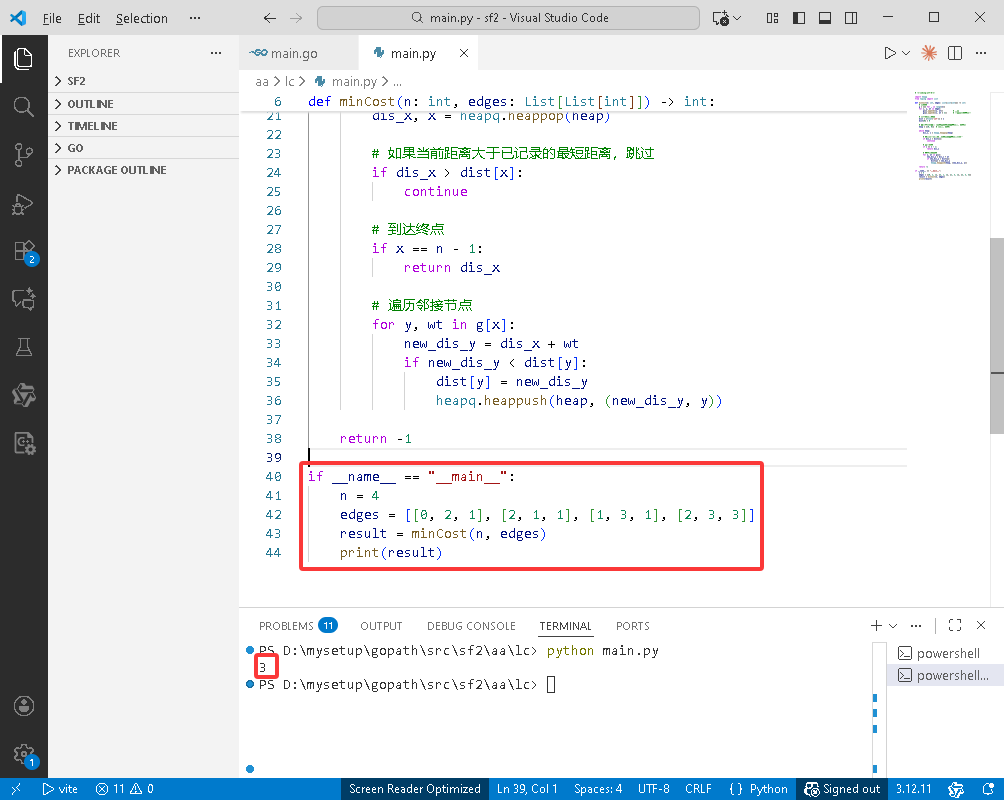 2026-01-18:边反转的最小路径总成本。用go语言,给定一个包含 n 个点(编号 0 到 n-1)的有向带权图。边集合 edges 中的每一项 edges[i] = [ui, vi, wi] 表示从 ui 指向 vi 的有向边,权重为 wi。 每个点都有一次特殊操作的机会:当你到达某个点 u 且还没使用过该点的这次机会时,你可以选择任意一条原本指向 u 的入边 v → u,把它临时改为 u → v 并立即沿着这条新方向移动一次。使用这次临时改向并穿越该边的代价为原边权的两倍(2*wi)。这种改向仅对这次移动生效,之后边的方向恢复且该点的机会就不能再用了。