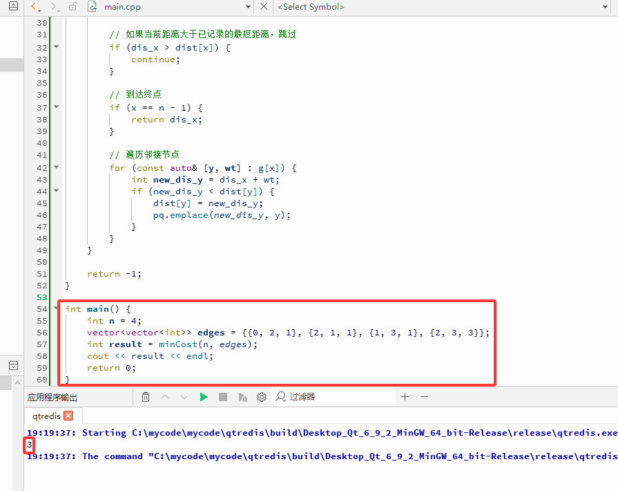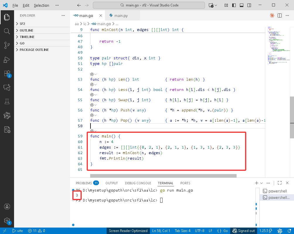 u -> v(权重为 w),在邻接表中创建两条边:u 到 v,权重为 w。这表示不进行反转,直接沿原方向移动。v 到 u,权重为 2 * w。这表示当位于节点 v 时,可以使用其特殊操作机会,将一条指向 v 的入边(即 u -> v)反转,并从 v 移动到 u,代价是原权重的两倍 。v 的特殊操作机会被隐式地建模为一条从 v 出发、指向其某个入边起点的、代价加倍的边 。dis,用于记录从起点 0 到每个节点的当前已知最短距离。初始时,起点 0 的距离设为 0,其他所有节点的距离设为极大值(math.MaxInt)。h,用于高效地获取当前未处理节点中距离起点最近的节点。堆中存储的是 (distance, node) 对。初始时,将起点 (0, 0) 加入堆中 。算法核心是一个循环,直到堆为空为止: