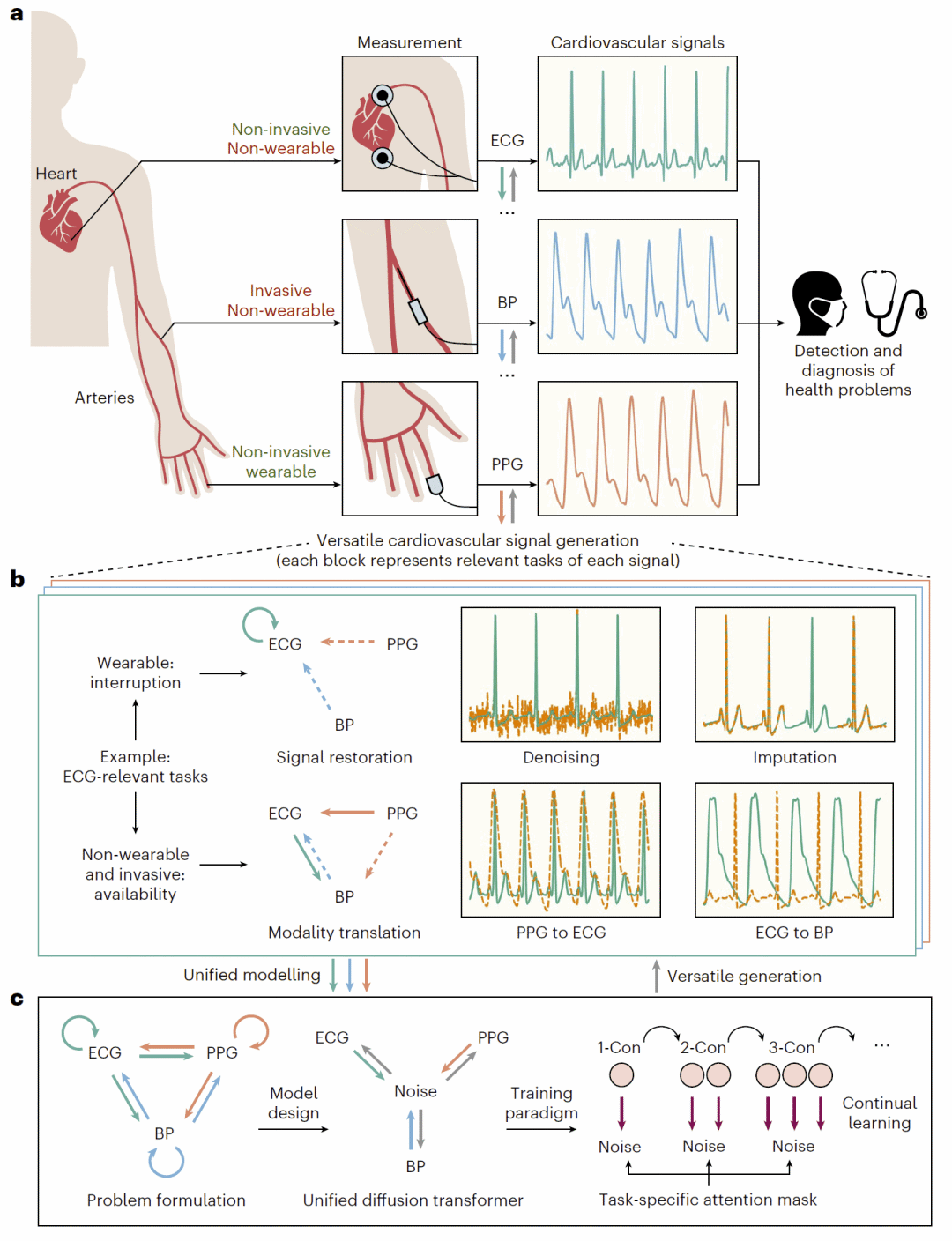 心血管信号(如光电容积描记信号 PPG、心电信号 ECG 和血压信号 BP)在生理上高度相关,共同反映心血管系统的健康状态。然而,由于可穿戴设备噪声大、信号中断频繁,以及侵入式测量带来的负担,这些信号在实际中往往难以被联合利用。研究人员提出了一种统一的多模态生成框架 UniCardio,基于扩散模型与 Transformer 架构,在单一模型中同时实现低质量信号修复与缺失信号合成。结果表明,该方法在多种生成任务和下游健康监测应用中均优于现有任务特定模型,展示了面向智能医疗的实用价值。