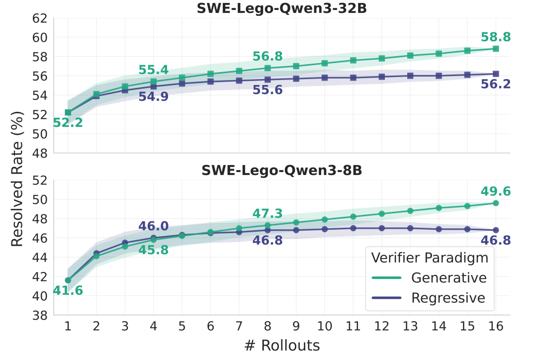 在 rollout 的个数(K 值)比较小时,生成式打分器与回归式打分器两者的性能相近;随着 rollout 的次数(K)的增加,回归式打分器趋于饱和,而生成式打分器持续改进。对于 SWE-Lego-Qwen3-8B,在 K=16 时差距达到 2.8%(49.6% vs 46.8%)。