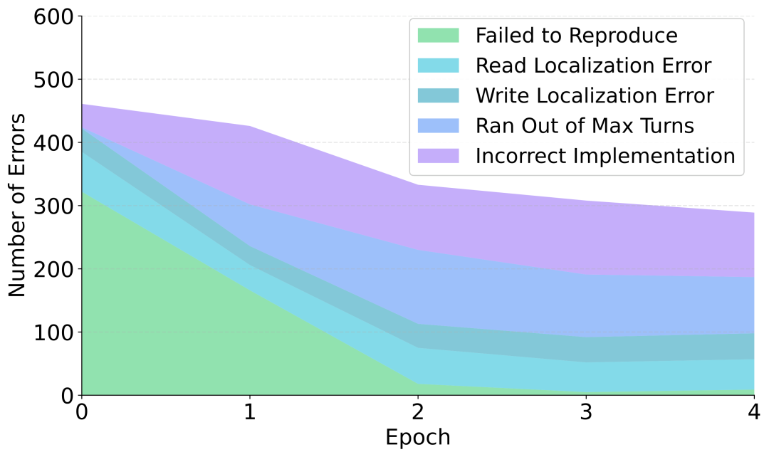 图 10:训练过程中错误类型的演变,从早期的 "无法复现" 到后期的 "错误实现"