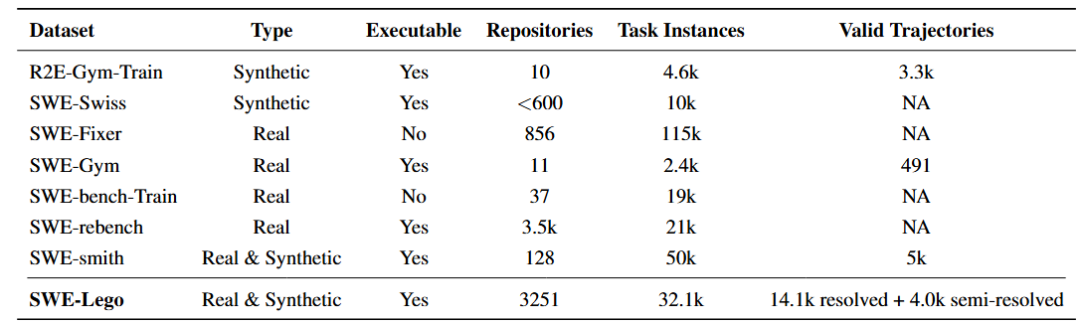 表 1:SWE-Lego 的可验证的任务实例和有效训练轨迹的统计以及和其他 SWE 相关工作的数据对比