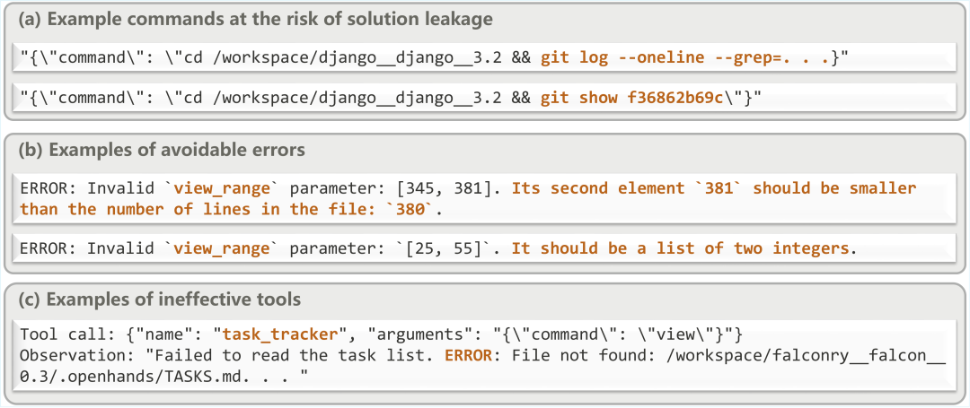 图 6:轨迹生成中的关键实践,包括防止 Git 泄露、处理工具错误、精简工具集