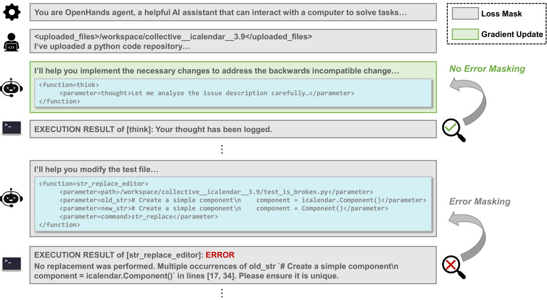 实现方法:使用正则表达式识别终端环境提供的错误消息,对相应的模型响应应用错误掩码。关键是要排除因复现 bug 或执行测试文件而产生的错误。这种方法保持完整的轨迹上下文,但只对正确的步骤计算损失,使模型能够学习正确的操作和恢复策略,而不会强化错误。通过强调学习正确操作,直接减少了核心推理失败,如 "错误实现" 和 "定位错误"。