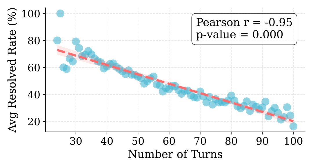 图 8:轨迹轮次与平均解决率之间的强负相关关系