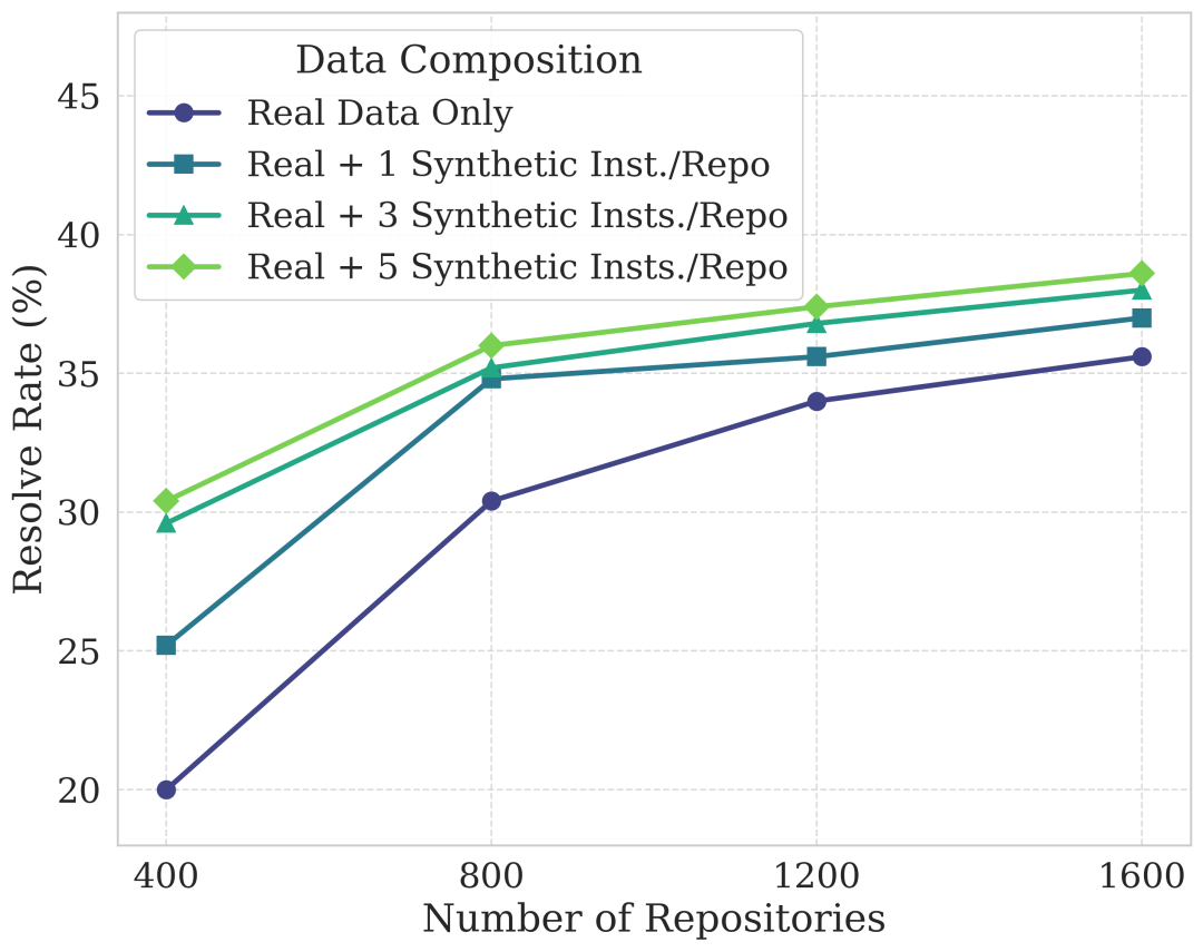 SWE-Lego 采用混合数据构建策略,结合真实世界数据和合成数据。真实世界数据来自严格筛选的 GitHub Pull Requests (PRs),这里的 PRs 中非测试文件作为 Golden Patch, 也就是这个任务的解决方案。真实 PR 数据具有贴近生产环境的优势,能够提供真实的 bug 的复杂性,真实的任务参考 SWE-rebench [1]。但是真实数据数量有限,且每个任务需要独立的沙箱环境,成本较高。