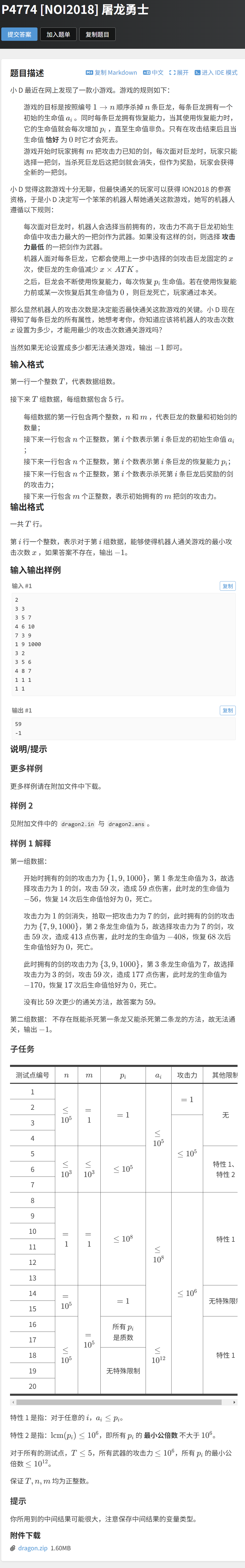 题目描述:玩家需按顺序杀死 n 条巨龙,每条巨龙有初始生命值ai、恢复能力pi。玩家用剑攻击 x 次后,巨龙生命值变为ai−x×ATK,随后巨龙不断恢复pi生命值,直至生命值非负。要求攻击后或恢复过程中生命值恰好为 0,求最小攻击次数 x,无解输出 - 1。