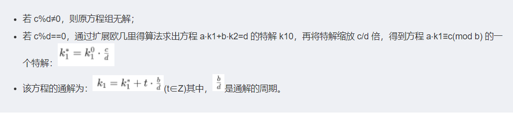 根据裴蜀定理,线性同余方程 a⋅k1≡c (mod b) 有解的充要条件是 gcd(a,b)∣c。设 d=gcd(a,b):