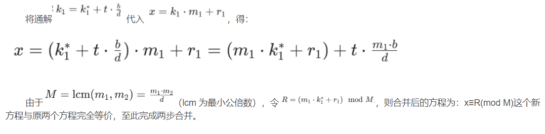 目标:找到一个新的线性同余方程 x≡R(mod M),使其与原两个方程等价(即解完全相同)。