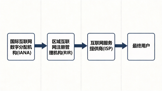 国际互联网数字分配机构(IANA)→ 区域互联网注册管理机构(RIR)→ 互联网服务提供商(ISP)→ 最终用户。