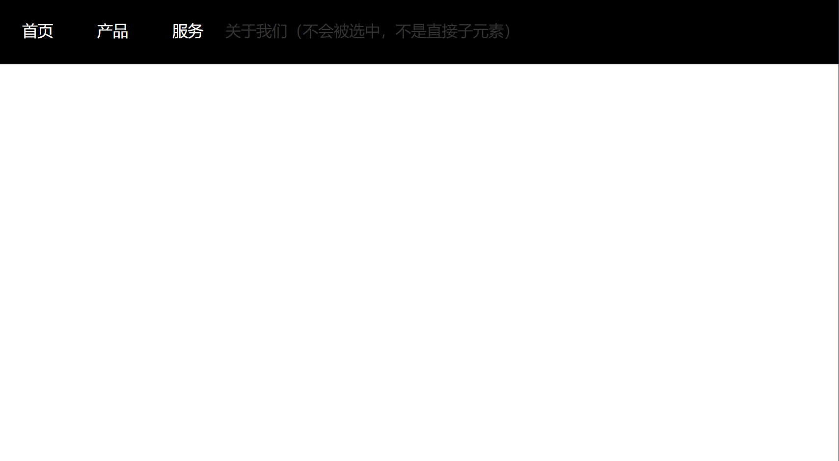 子选择器 | 父选择器 > 子选择器 | 选中父元素的直接子元素 | 选择器之间用 > 分隔,只选直接子元素 | 只需要父元素的直接子元素,不含深层后代 |