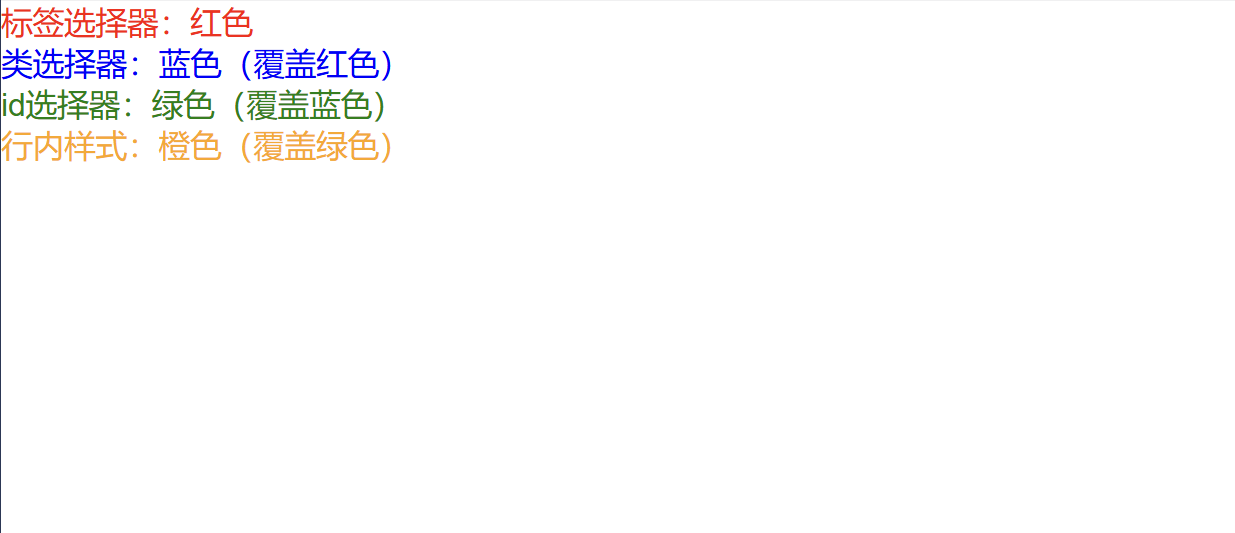 <p>:红色(标签选择器);<p>:蓝色(类选择器覆盖标签选择器);<p>:绿色(id 选择器覆盖类选择器);<p>:橙色(行内样式覆盖 id 选择器)。