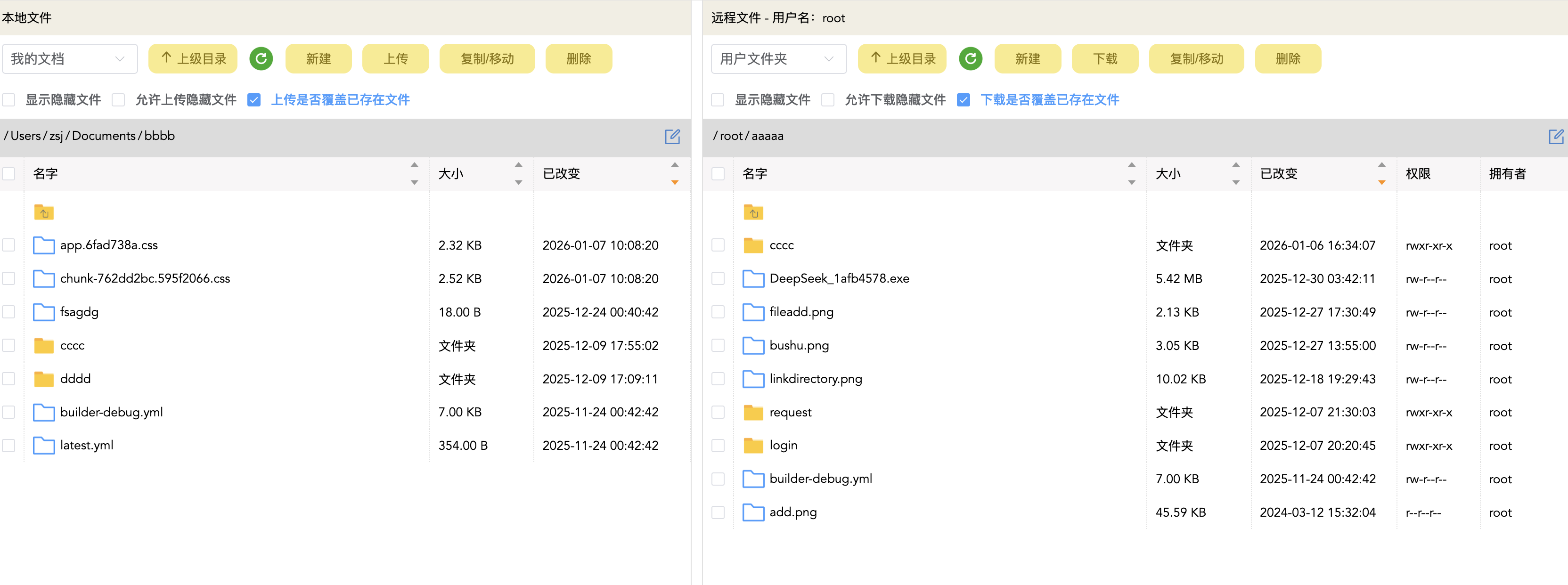 上传的界面如下,可以对比本地和远程文件,可以清楚看到文件的时间和权限等等。