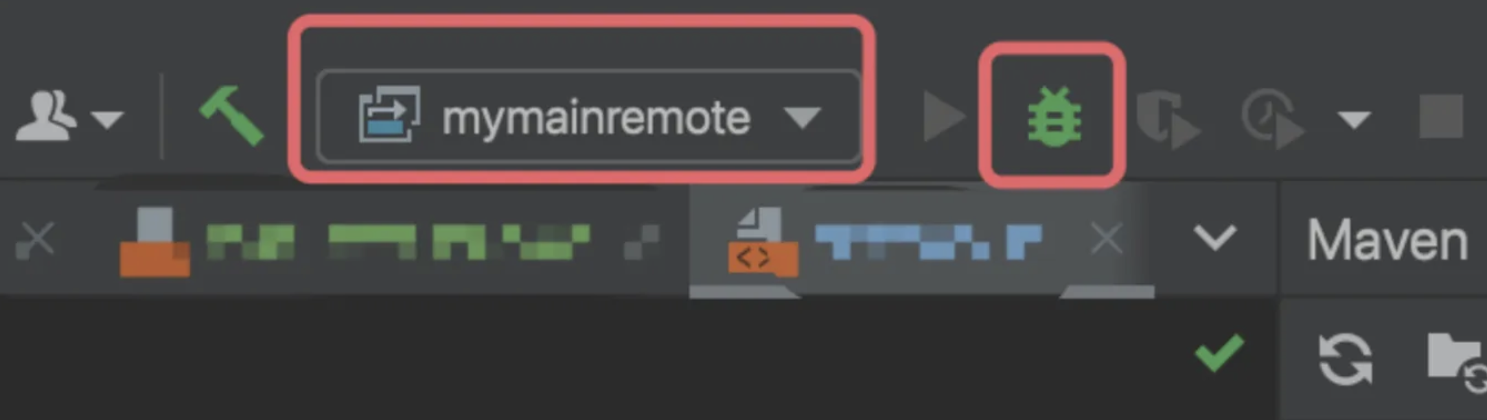 如下图,在idea的主界面,右上角,找到调试的按钮,在调试按钮左侧的下拉列表选择刚才创建的远程启动项,进行调试,如下例图: