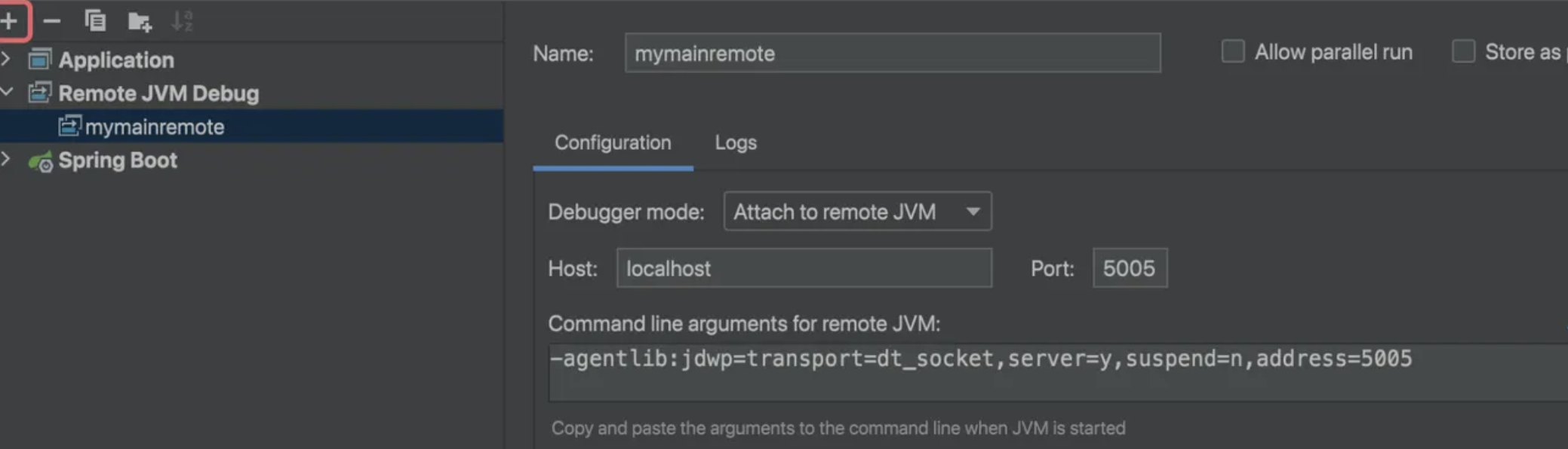 假如以前启动的时候已经添加过启动配置,可以不用不用管这一步,假如没有添加启动参数,需要添加下面的代码,其中,5005是调试的端口,代码如下: