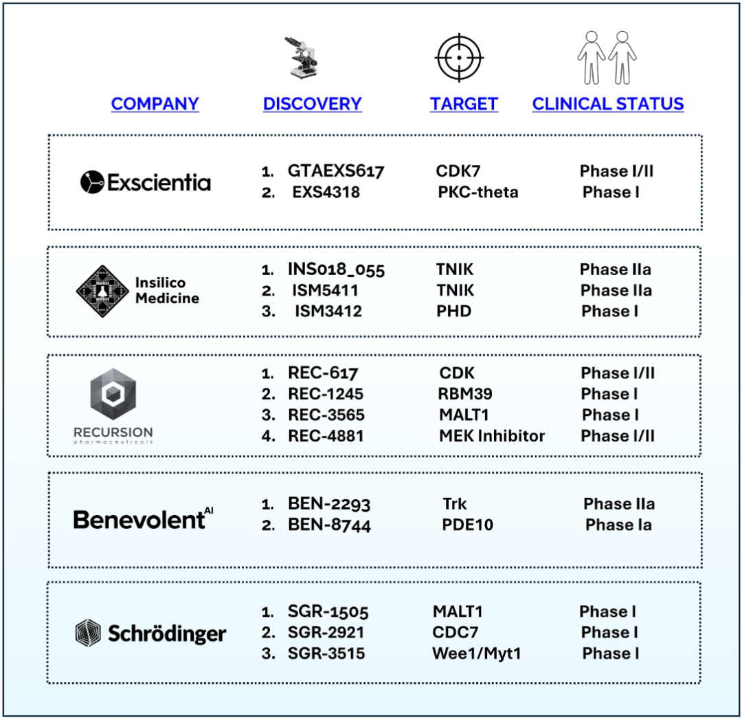 为此,文章考察了五家已成功将创新候选药物推进至临床阶段的领先AI驱动药物发现公司:Exscientia、Insilico Medicine、Recursion、BenevolentAI以及Schrödinger(薛定谔)。这些平台涵盖了多种AI技术路径,包括生成化学、基于物理的分子模拟、表型筛选以及基于知识图谱的靶点发现(图2)。此外,分析了各平台如何在研发全流程中应用AI(图3),其关键技术差异化优势,以及在临床候选物交付方面的历史表现。