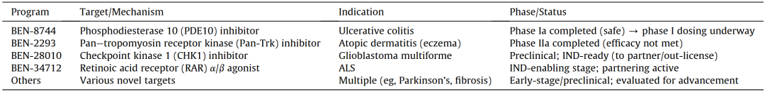 BenevolentAI同时也投入资源构建自主的新药研发管线,旨在验证其AI平台提出的新型靶点。到2022年,公司已推动至少两个新型小分子项目进入临床阶段:用于特应性皮炎(湿疹)的局部外用广谱Trk抑制剂BEN-2293以及用于溃疡性结肠炎的口服PDE10抑制剂BEN-8744(表4)。2023年,BEN-2293成为首个在临床试验中失败的高调AI来源药物。尽管该药在安全性和耐受性方面表现良好,但在改善湿疹严重程度或瘙痒方面并无显著优势。这一结果对公司造成了重大打击。最终,BenevolentAI在多年研发后终止了BEN-2293项目,说明即便是AI识别的靶点,也必须接受人类生物学的最终检验,而并非所有靶点都能成功。