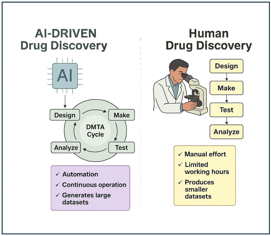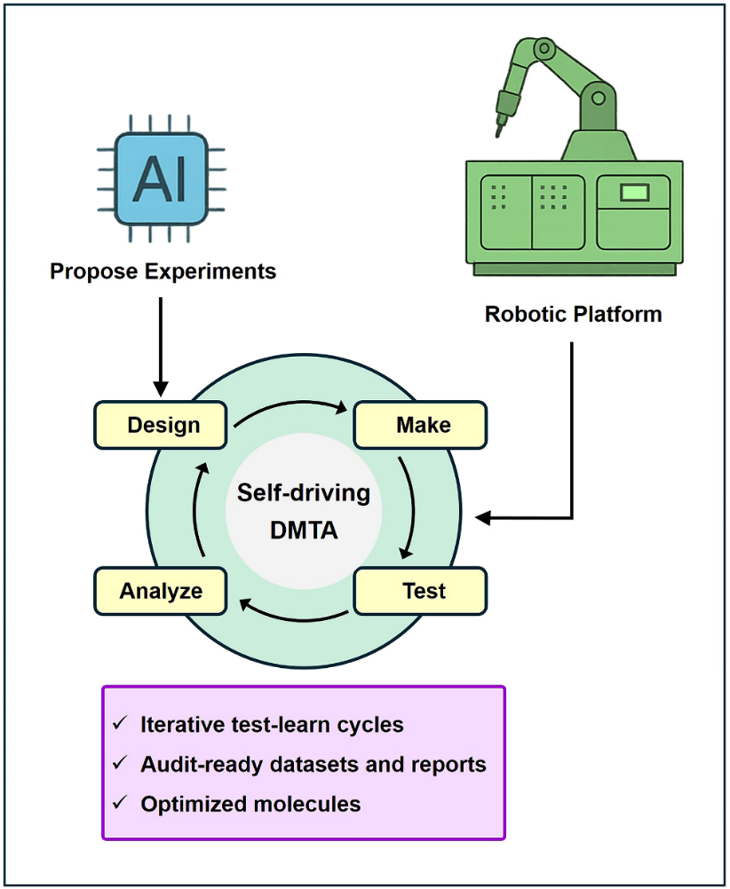 机器人技术与AI的深度融合,正将药物发现与药理学转变为一种高度高效、闭环、数据驱动的流程,并有潜力从根本上重塑科研创造力与发现模式。AI模型可以提出实验假设,而机器人平台则能够全天候持续执行实验。在这一体系中,药物DMTA工作流程形成自我强化的闭环:实验结果不断反馈至AI模型,模型据此修正预测并生成质量逐步提升的候选分子。最终目标是产出可审计的数据集、系统化报告以及适合推进临床开发的优化分子(图8)。这种“自动驾驶式”的DMTA实验室,是自动化高通量筛选与流动化学的自然演进,标志着药物发现正迈向完全自主决策的新阶段。AI与机器人融合趋势的代表性实践包括阿斯利康 iLab(哥德堡)、Recursion(盐湖城)、Insitro(南旧金山)、Emerald Cloud Lab等。