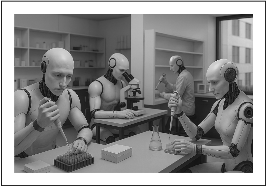 图9 人形机器人在AI集成实验室中执行药理和生化实验。注:图为AI生成的概念性插图,用于展示假想的AI集成实验室技术,并不代表实际实验室系统或设备。