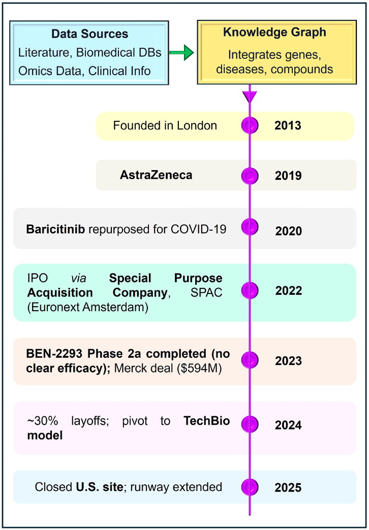 BenevolentAI成立于2013年,总部位于伦敦,是将人工智能应用于靶点识别和药物重定位领域的先行者之一。其平台核心是庞大的知识图谱,整合了科学文献、生物医学数据库、多组学数据以及临床信息(图6)。通过自然语言处理和图机器学习,BenevolentAI系统能够在基因、疾病与化合物之间提出人类研究人员不易察觉的新关联。其目标是为疾病发现新的治疗靶点,或为现有药物挖掘新的适应证。这一方法的标志性成功案例是2020年baricitinib的发现。baricitinib在COVID-19患者中显示出显著的降低死亡率的疗效,并获得紧急使用授权,成为最早真正应用于患者的AI预测疗法之一(图6)。