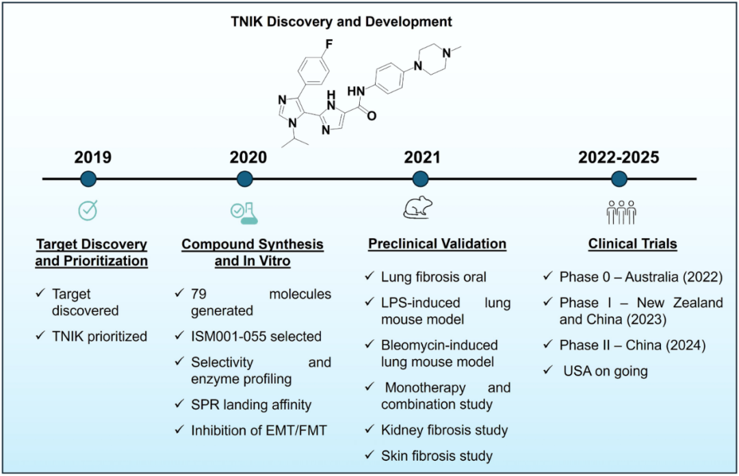 Insilico的标志性成果出现在2021-2022年,其AI系统为特发性肺纤维化(IPF)识别出一个全新的纤维化相关靶点酶TNIK,并针对该靶点生成了一种小分子TNIK抑制剂ISM001-055(现名Rentosertib;图5)。该项目从AI驱动的假设提出到形成临床候选物仅用了约18个月,成为最早实现AI发现靶点+AI设计分子并进入人体试验的案例之一。