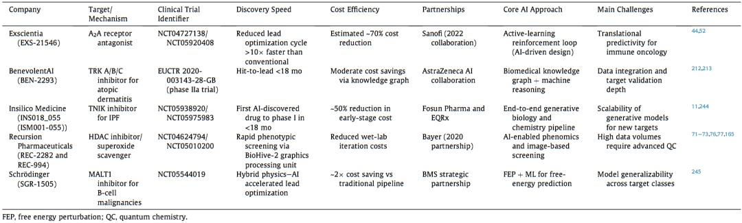 上述五家公司展示了AI在当前药物发现中应用的多样化且互补的路径。表6对它们的平台特点、迄今取得的成就以及所面临的挑战进行了比较。