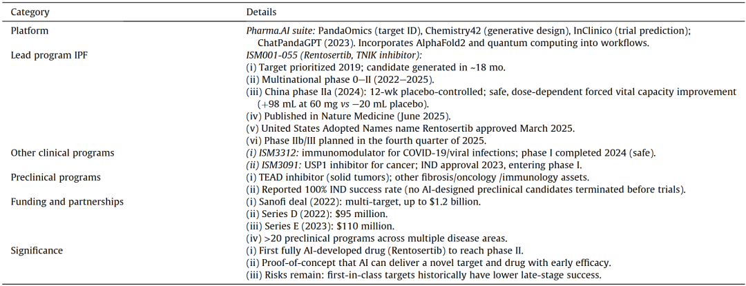 Insilico Medicine成立于2014年,总部位于香港和纽约,是端到端AI驱动生物技术公司的典型代表。其综合性Pharma.AI平台由多个相互连接的模块组成:PandaOmics用于AI驱动的靶点识别,通过挖掘组学数据和文献发现新的疾病驱动因子;Chemistry42用于生成式分子设计;InClinico用于临床试验结局预测(表3)。