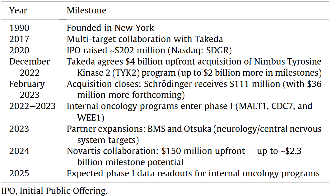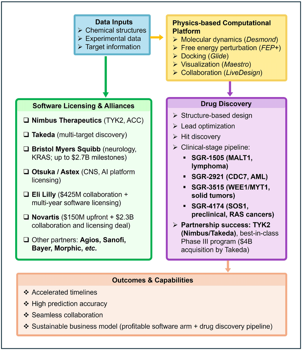 薛定谔总部位于纽约,成立于1990年(表5)。作为计算化学软件领域的既有领导者,薛定谔随后将业务拓展至AI驱动的药物发现领域。其核心技术是基于物理学的分子模拟平台,数十年来广泛应用于结构基础的药物设计,例如虚拟筛选以及用于预测结合亲和力的自由能计算(图7)。