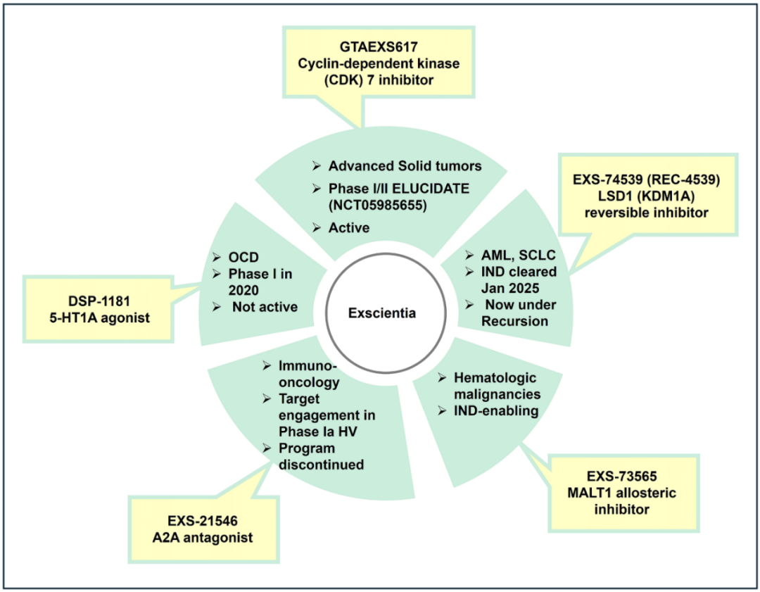 截至目前,Exscientia尚无任何AI设计的药物进入Ⅲ期临床试验,但已有多项候选物处于或即将进入Ⅰ/Ⅱ期临床阶段。尽管如此,公司披露的一些指标依然令人瞩目。例如,在一项CDK7抑制剂项目中,仅合成了136个化合物便成功确定了临床候选物,而传统项目往往需要合成数千个化合物。展望未来,在Recursion体系下,Exscientia的生成式AI将与大规模内部湿实验数据相结合,这一组合被认为有望进一步提高成功率。