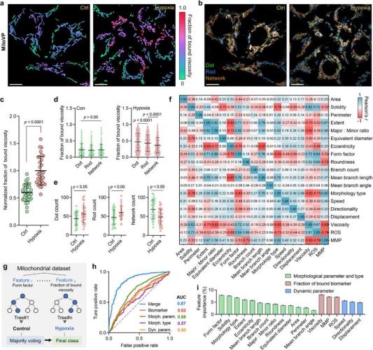 研究团队首先构建了由三种线粒体靶向荧光探针组成的多参数检测体系:其中自研双阳离子黏度探针 MitoVP 用于检测线粒体微环境黏度,MitoSOX Red 与 JC-10 分别用于测定ROS水平和膜电位。随后,他们基于团队此前开发的深度学习框架 MoDL(Nat. Commun. 2025, 16, 743),实现了单线粒体级别的图像自动分割与形态特征提取,并结合机器学习模型完成常氧与缺氧条件下线粒体状态的智能分类。结果显示,模型在区分不同氧环境下的线粒体时表现出较高的准确性,并揭示黏度信号是缺氧应激下最关键的功能性生物标志物。