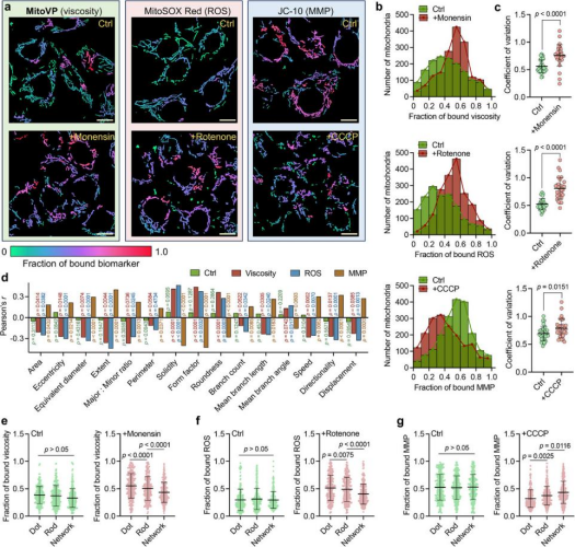 该研究通过将 MoDL 深度学习分割算法与多参数线粒体靶向荧光探针相结合,实现了单线粒体尺度的形态—功能关联解析。结果表明,基于点状、杆状和网络状的形态语义分类能够有效揭示线粒体结构异质性,不同形态在黏度、ROS 和膜电位等功能指标上表现出显著差异。药理扰动与动态成像分析进一步显示,线粒体功能受损会伴随形态由网络向碎片化结构转变,并导致功能参数分布和运动行为的显著异质化。其中,点状线粒体对黏度和 ROS 升高最为敏感,而网络状结构在维持膜电位方面更具优势,整体揭示了线粒体形态与功能在单体层面存在紧密而非线性的耦联关系。该分析策略为解析线粒体亚群功能差异和调控机制提供了新的定量化思路。