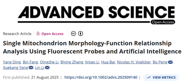 Yang Ding#, Bin Fang#, Qingzhe Li#, Biying Zhang, Jintao Li, Hua Bai, Nicolas H. Voelcker, Bo Peng*, Xuekang Yang*, and Lin Li*.“Single Mitochondrion Morphology-Function Relationship Analysis Using Fluorescent Probes and Artificial Intelligence.”Advanced Science(2025).