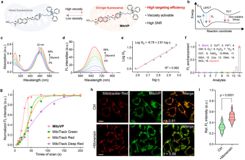 图 2. MitoVP的分子结构设计和光物理性能测试