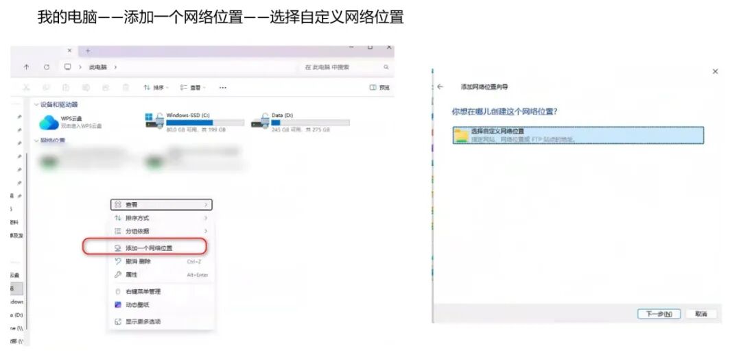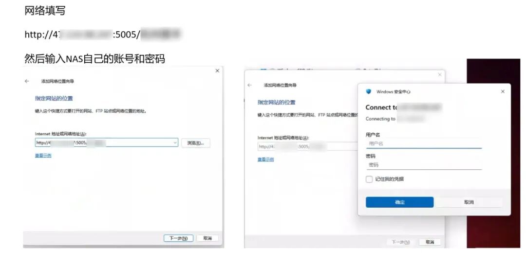 添加网络位置,输入云服务器的公网IP+端口5005和具体目录 输入NAS的账号与密码即可进行挂载