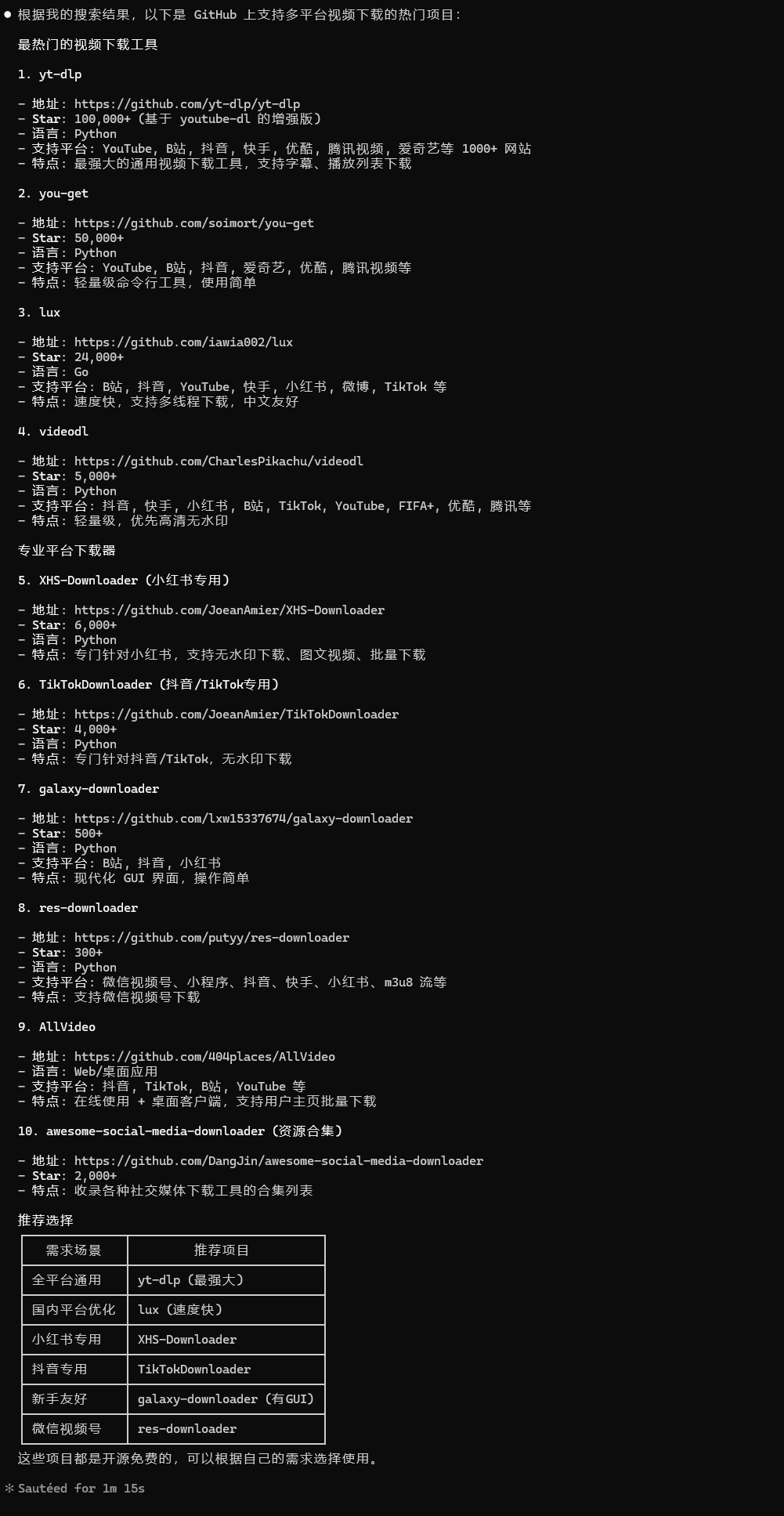 排名第一,也是最为推荐的项目当属yt-dlp,全平台通用,也是功能最强大的视频下载工具,支持平台: YouTube, B站, 抖音, 快手, 优酷, 腾讯视频, 爱奇艺等 1000+ 网站