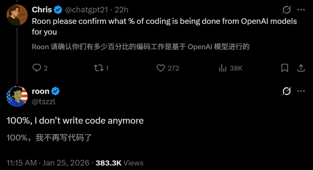 Codex,已经正式接管了OpenAI研究员「Roon」100%的代码编写工作!